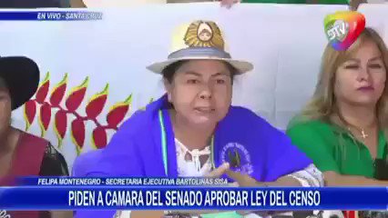 🔵#ANF | #SantaCruz La ejecutiva de la Federación Departamental de Mujeres Bartolina Sisa, Felipa Montenegro, pide la aprobación de la ley del #censo. «Por el bienestar de Santa Cruz y de toda Bolivia pedimos (al Senado) que puedan tratar la ley lo más antes posible», dijo. 📹DTV https://t.co/yncQKLTJld