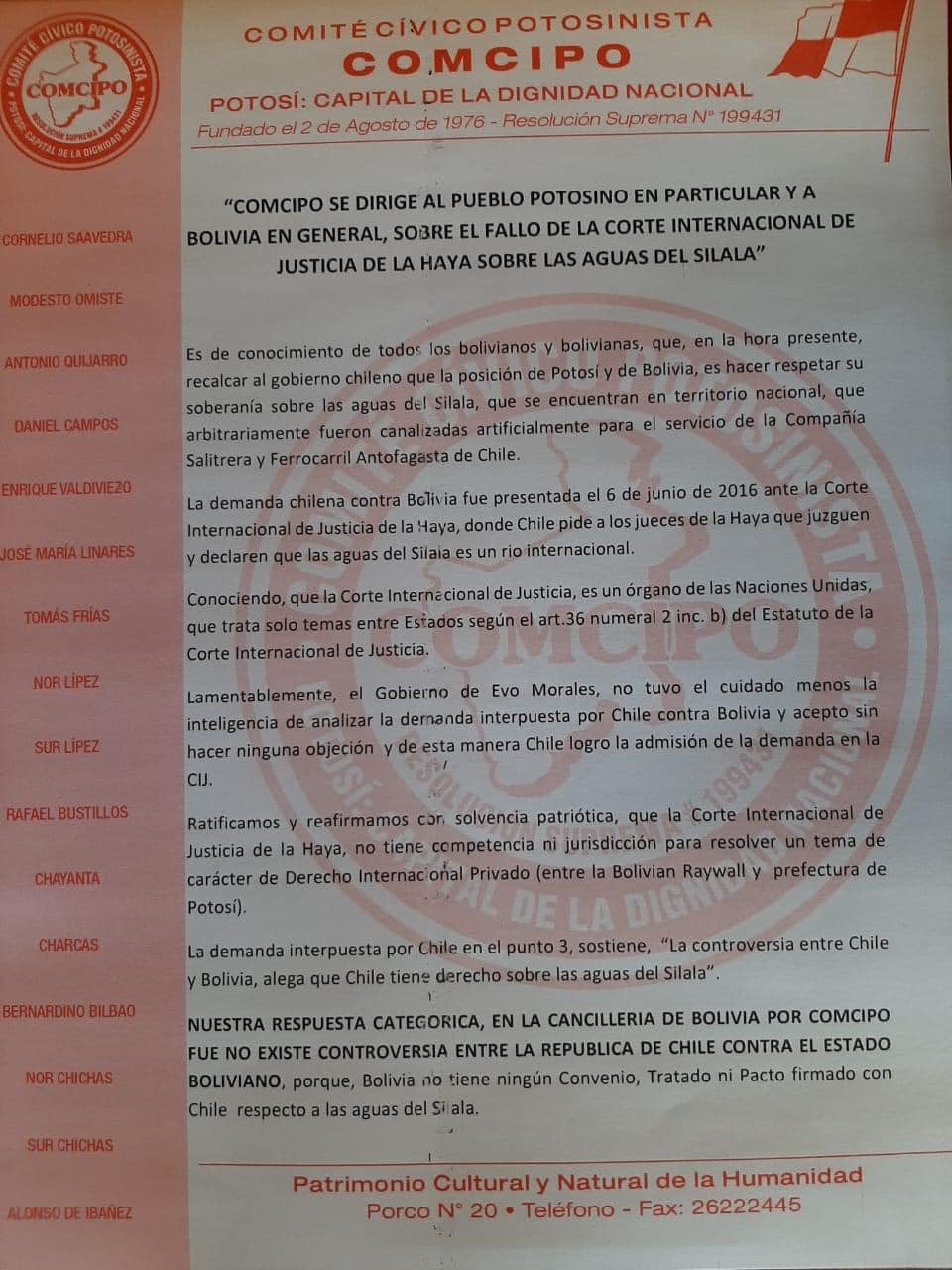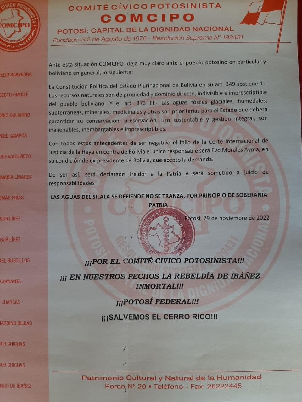 COMCIPO declarará “traidor de la patria” y procesará a Evo si el fallo sobre el rio Silala sale adverso