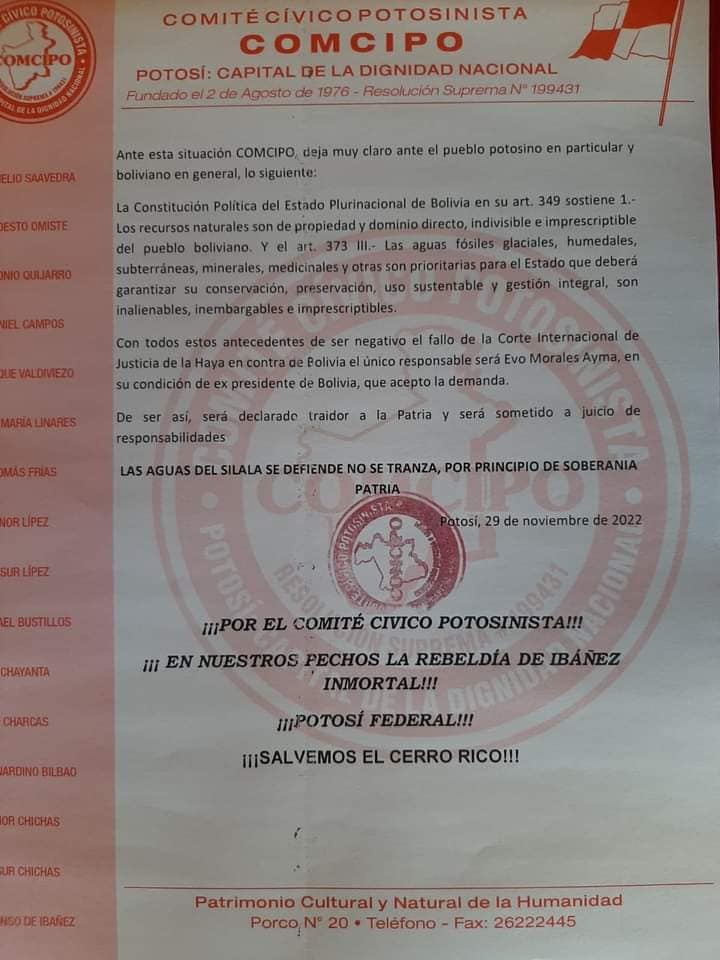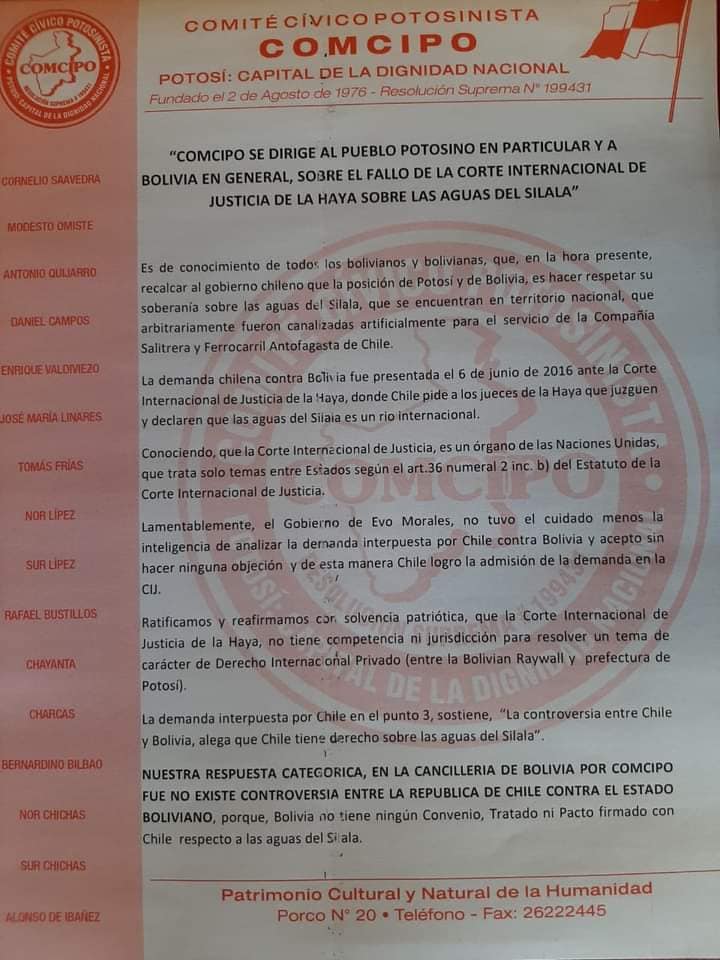 #Comcipo dice que si fallo de la #LaHaya sobre el #Silala es negativo el unico responsable será Evo y será declarado «traidor a la Patria y sometido a juicio de responsabilidades»