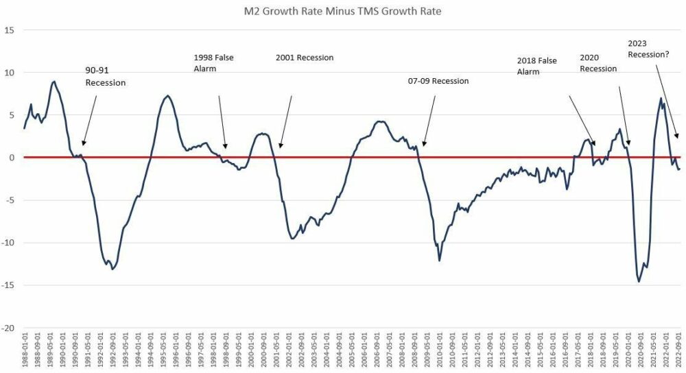 #EEUU | Más métricas que indican recesión en 2023: El crecimiento de la oferta monetaria TMS (que proporciona una mejor medida de las fluctuaciones de la oferta monetaria que M2) en octubre, cayó a mínimos de 39 meses. Si la diferencia entre M2 y TMS es negativa, habrá recesión. https://t.co/cS7CKG9mkX