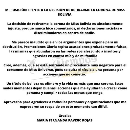 “no discriminó a nadie», es parte del comunicado que saco la ahora exmiss Bolivia Universo, Fernanda Pavisic, además aseguro que la decisión de Promociones Gloria como “injusta”.