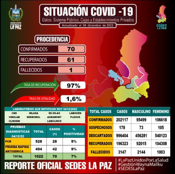 🔵#ANF | #Sociedad El Servicio Departamental de Salud de La Paz reportó este domingo 70 casos positivos de #COVID19, un fallecido y 61 recuperados. https://t.co/PhkHEtd0Gy