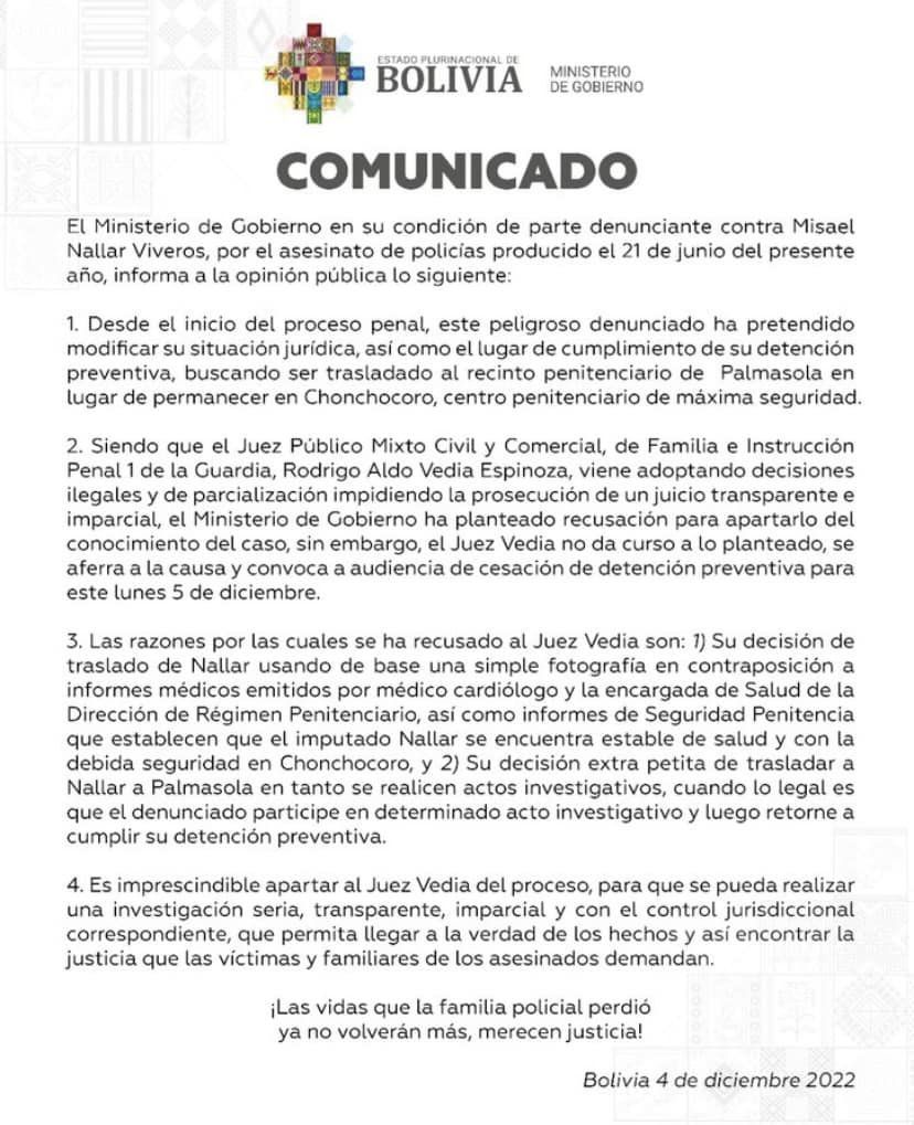 Denuncian desaparición de motocicleta del “Caso:Nallar” utilizada para liquidar a los 3 policías mientras el ministerio de gobierno emite comunicado señalando que es “imprescindible apartar al juez Rodrigo Vedia del proceso, para realizar una investigación seria, transparente e imparcial”