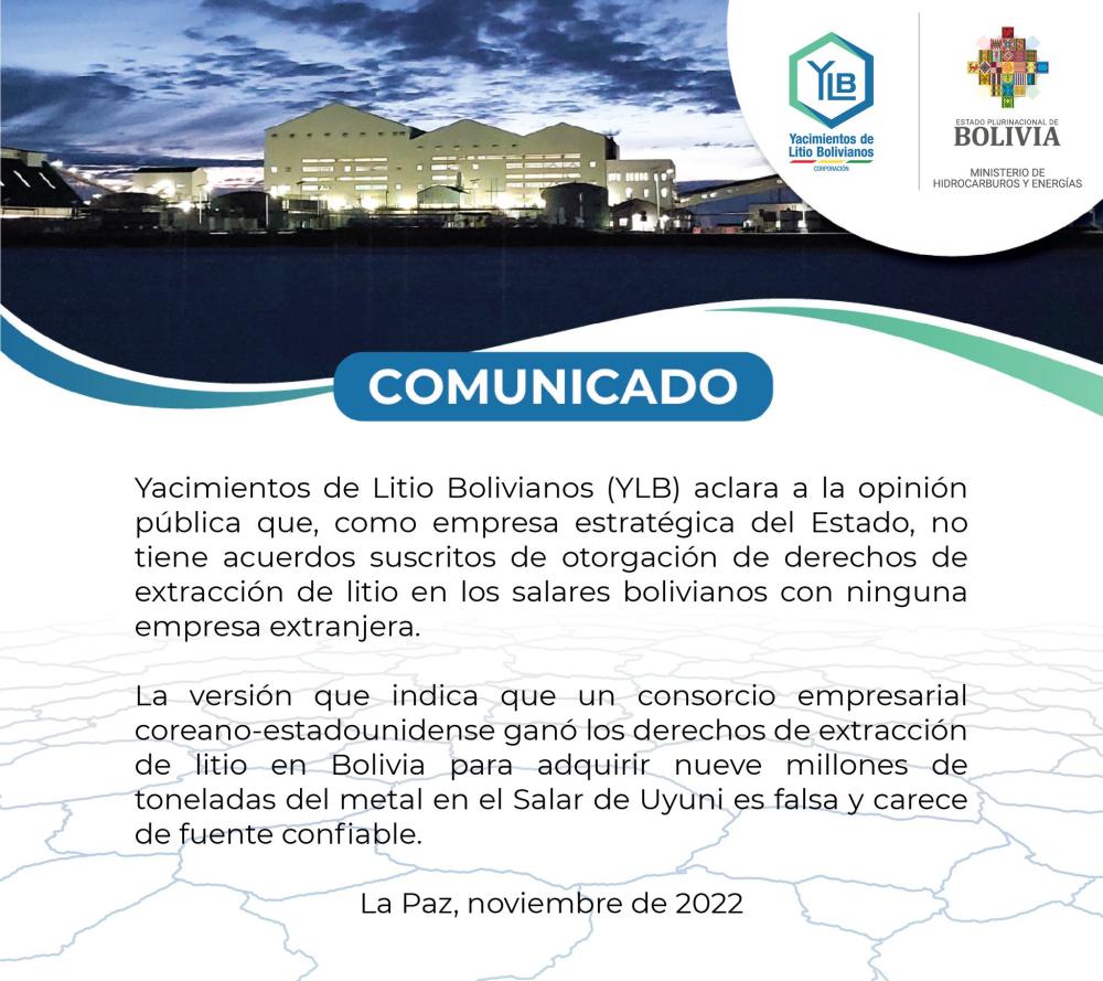 Ante dicha publicación, YLB aclaró que como Estado boliviano no se tiene convenios firmados sobre la entrega de derechos de extracción de litio en los salares que hay en Uyuni, Potosí.