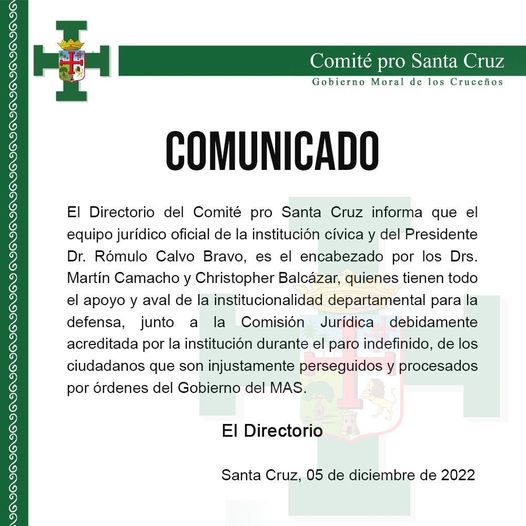 Comité pro Santa Cruz emitió comunicado sobre defensa legal del presidente Rómulo Calvo ante procesos por paro indefinidoCategorías NoticiasEtiquetas , Facebook, Gigavisión 06/12/2022 [vid_embed] Fuente: Gigavisión => Recibir por Whatsapp las noticias destacadas