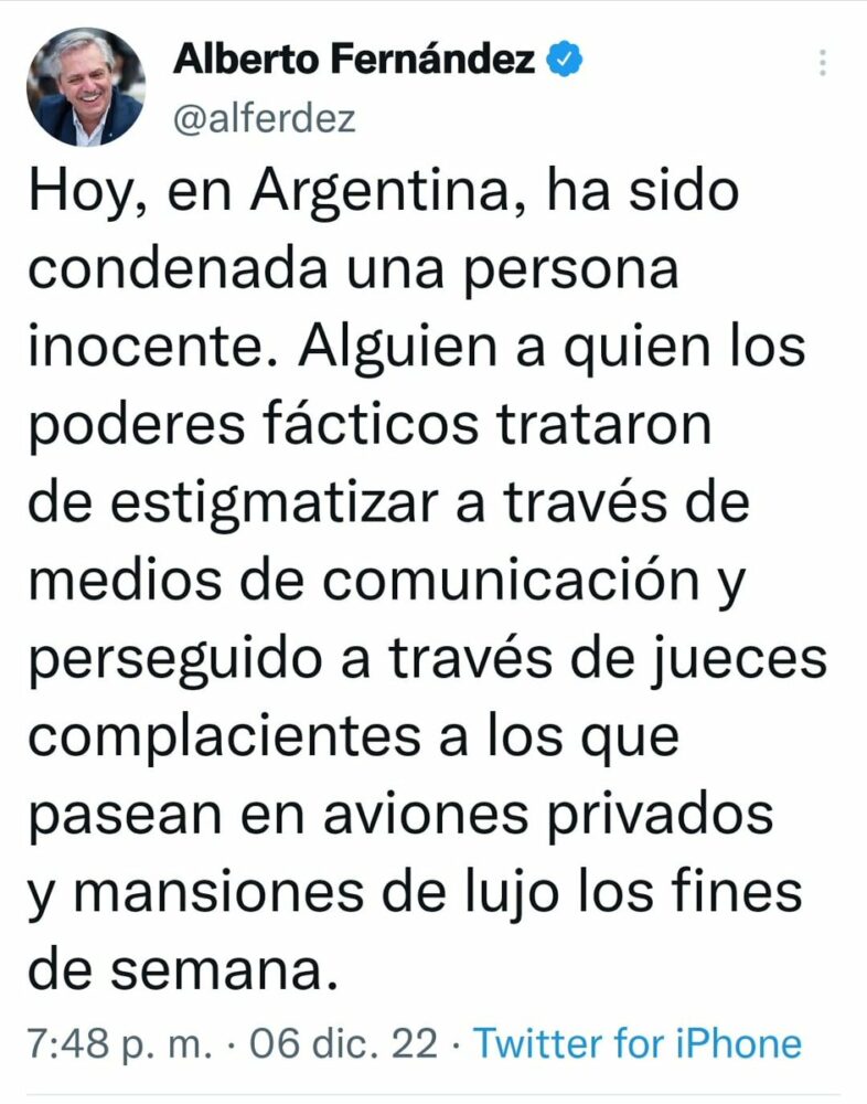 🔵#ANF I En alusión a Cristina Fernández, el Presidente de #Argentina aseguró que «hoy ha sido condenada una persona inocente». Según el mandatario, la vicepresidenta habría sido estigmatizada por la prensa y perseguida por «jueces complacientes a poderes fácticos». https://t.co/UnkbL4KeDD