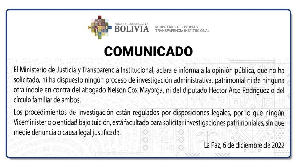 El Ministerio de Justicia y Transparencia Institucional desmintió este martes que haya solicitado alguna investigación en contra del exviceministro de Régimen Interior Nelson Cox o el diputado del MAS Héctor Arce. “No ha solicitado, ni ha dispuesto ningún proceso de investigación administrativa, patrimonial ni de ninguna otra índole en contra del abogado Nelson Cox Mayorga, ni del diputado Héctor Arce Rodríguez o del círculo familiar de ambos”, informó en un comunicado.