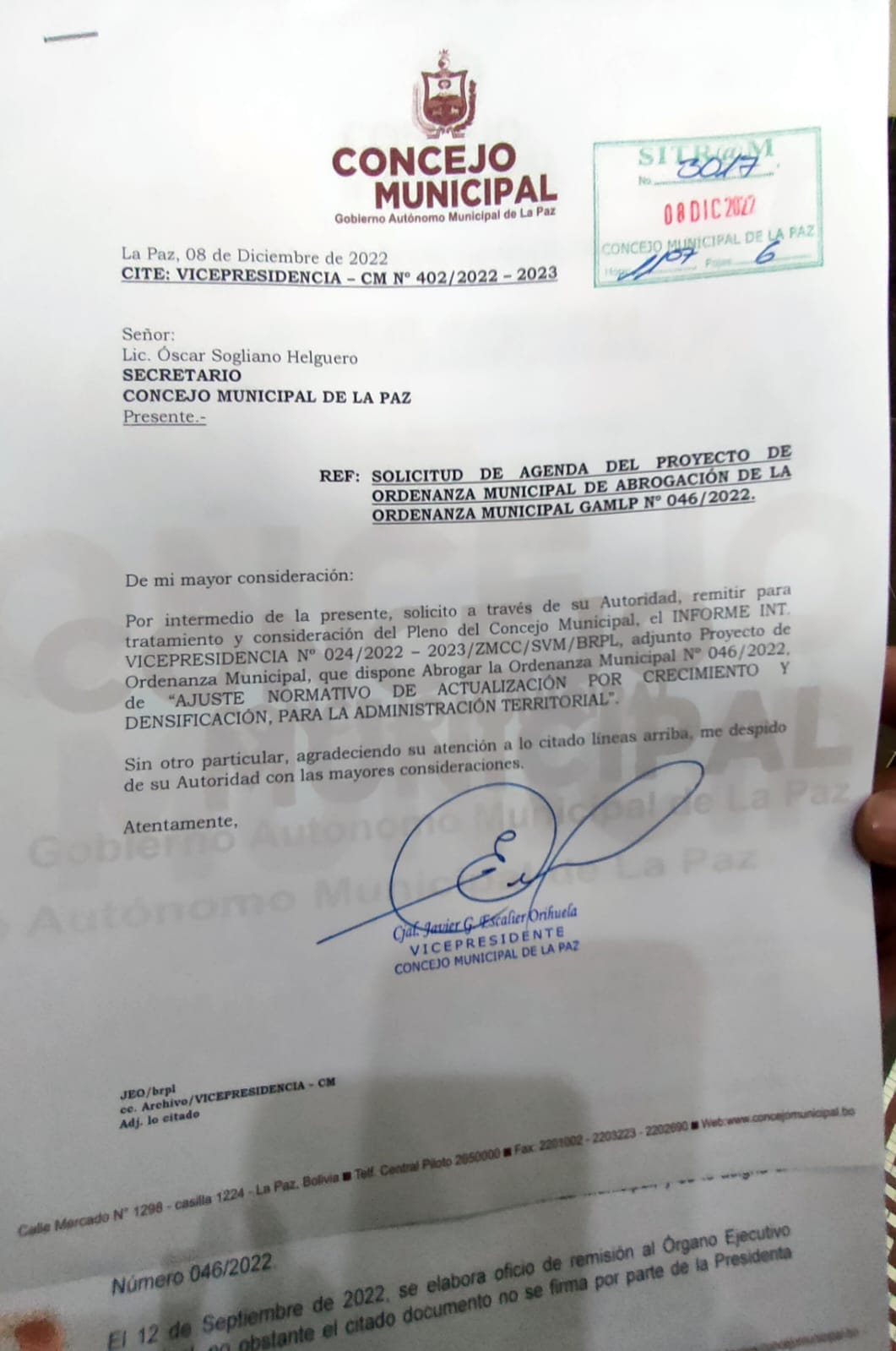 Vicepresidente del Concejo municipal de La Paz, Javier escalier quien promulgo la ordenanza municipal que permite contrucciones irrestrictas mediante una carta solicita al secretario del concejo agendar un proyecto de Ley para la ABROGACION de la Ordenanza 046 que fue cuestionada y rechazada por varios sectores incluído el alcalde Iván Arias.