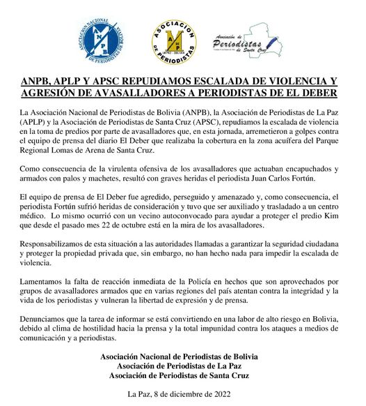 Asociaciones de periodistas repudian escalada de violencia y agresión de avasalladores a periodista en Santa Cruz