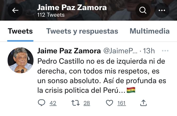 Expresidente Jaime Paz Zamora se refiere a expresidente del Perú: “Con todos mis respetos, es un sonso absoluto”Categorías NoticiasEtiquetas , Detrás de la Verdad, DTV, Facebook 09/12/2022 [vid_embed] Fuente: DTV => Recibir por Whatsapp las noticias destacadas