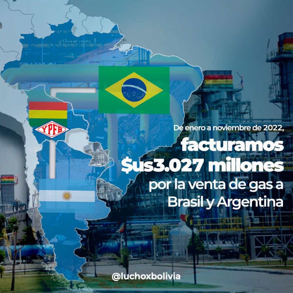 De enero a noviembre de 2022, nuestra empresa @YPFB_corp facturó más de $us3.027 millones por la venta de gas a #Brasil y #Argentina, alrededor del 49% más que en el mismo periodo de 2021. Estos recursos significan más inversión y políticas sociales en favor del pueblo boliviano. https://t.co/Hx0e2X7pFX