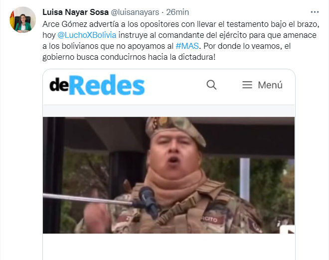 🔵 #ANF | La diputada de CC Luisa Nayar afirma que el presidente @LuchoXBolivia instruye al comandante del ejército «amenazar a los bolivianos que no apoyan al #MAS». «El Gobierno busca conducirnos hacia la dictadura», tuiteó. https://t.co/AReTnpobDR