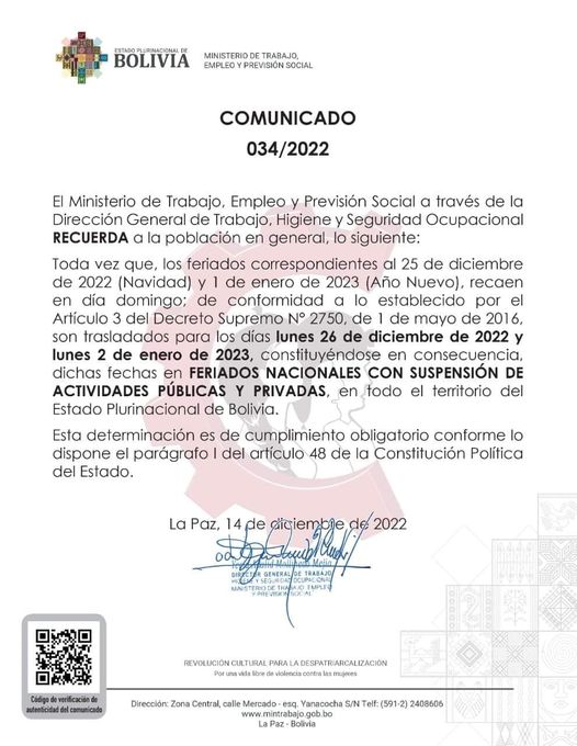 El Ministerio de Trabajo recuerda a las y los trabajadores y población en general que los feriados de los días 25 de diciembre y 1 de enero de 2023 serán trasladados al lunes 26 de diciembre de 2022 y lunes 2 de enero de 2023, de acuerdo con el D.S. 2750 de 1 de mayo de 2016.