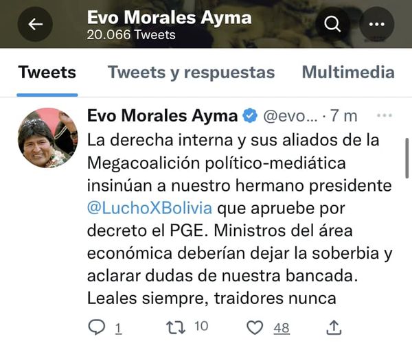 Evo Morales Ayma : “La derecha y sus aliados insinúan a nuestro hermano Arce que apruebe por decreto PGE”