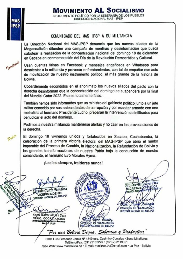 🔵 #ANF I El MAS-IPSP denunció que "los nuevos aliados de la megacoalición difunden una campaña de mentiras y desinformación" para boicotear la concentración del 18 de diciembre en Sacaba, #Cochabamba, por el Día de la Revolución Democrática y Cultural. pic.twitter.com/zsTZD0n3AS