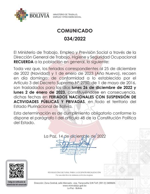 Ministerio de Trabajo confirma que feriados del 25 de diciembre y 1 de enero de 2023 pasan al 26 de diciembre y al 2 de enero de 2023, respectivamente