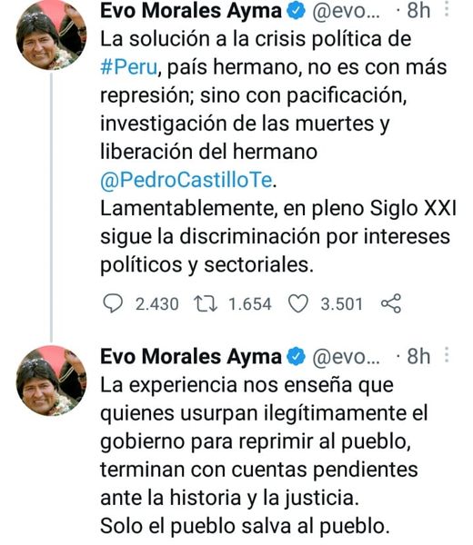 Según Evo la solución a crisis política de #Peru es la liberación de Pedro Castillo