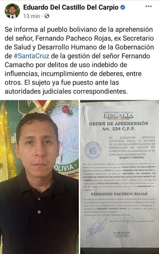 El ministro de gobierno, Eduardo del Castillo, a través de sus redes sociales, confirmó la aprehensión del ex secretario de salud de la gobernacio, Fernando Pacheco.