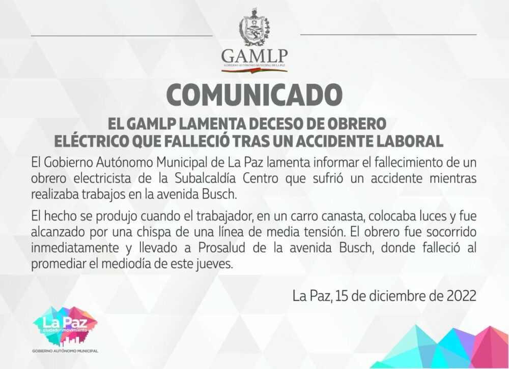 🔵 #ANF | La @LaPazAlcaldia informa que un obrero electricista falleció este jueves tras sufrir un accidente laboral mientras colocaba luces en la avenida Bush. pic.twitter.com/QQbpC3UtR0