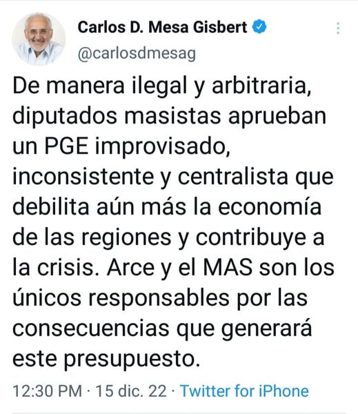 Mesa dice que PGE fue aprobado de forma ilegal y responsabiliza a Arce y al MAS de las con…
