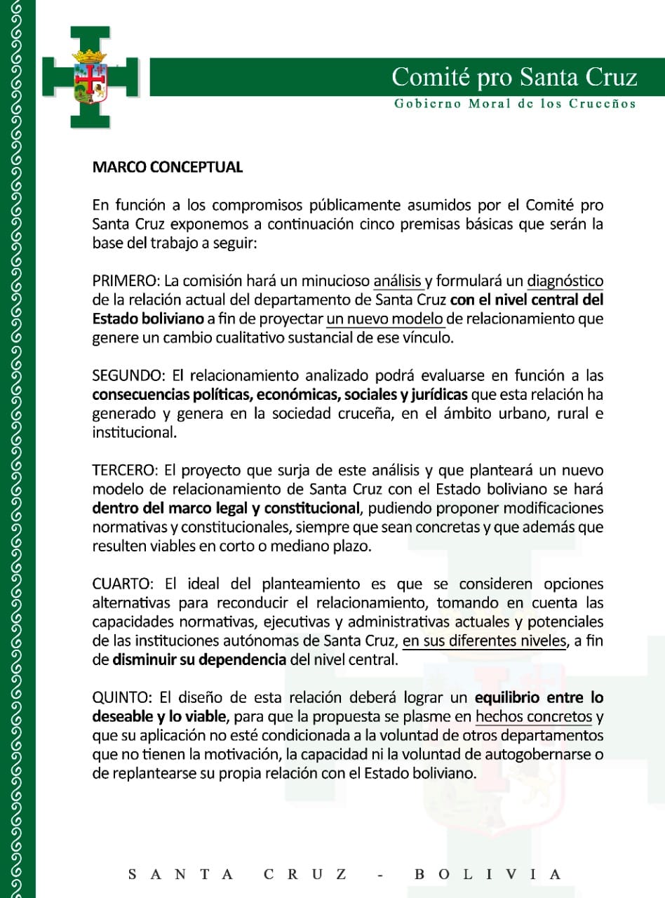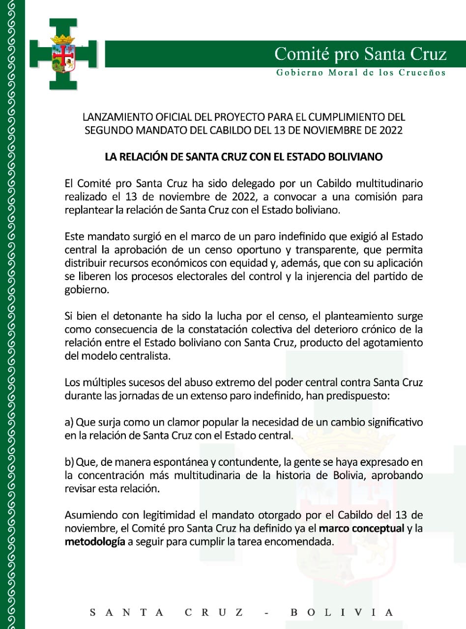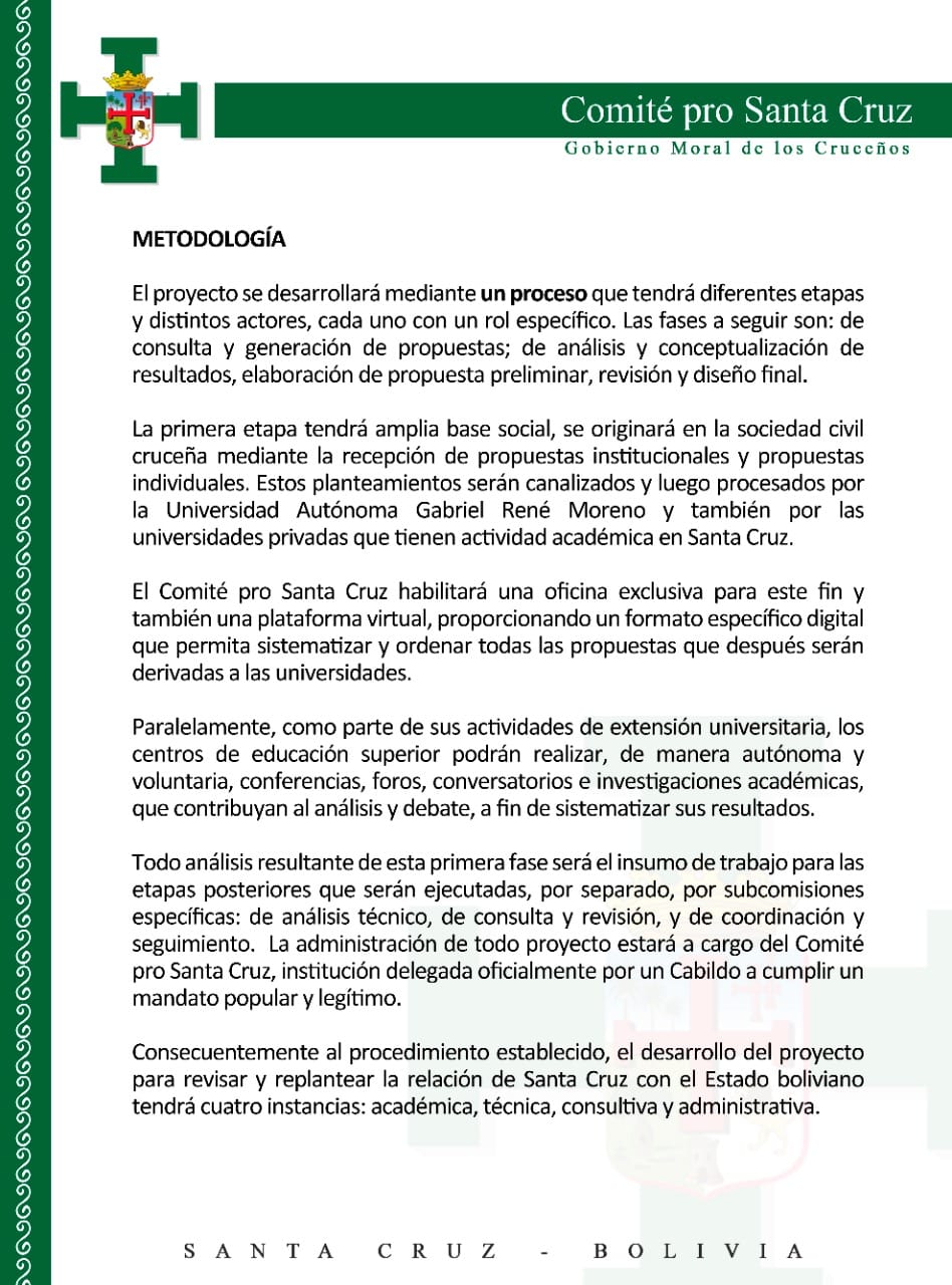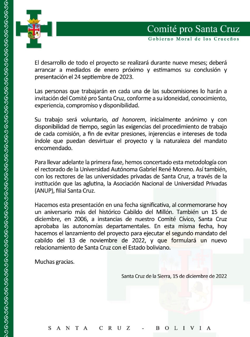 El Comité Cívico Pro #SantaCruz prevé que la comisión tratará la propuesta en un plazo de nueve meses y finalizará para el 24 de septiembre de 2023.
