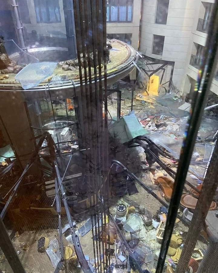 Una imponente pecera de 16 metros de altura y 11.5 metros de diámetro, estalló arrasando e inundando la recepción del hotel Radisson Blue.