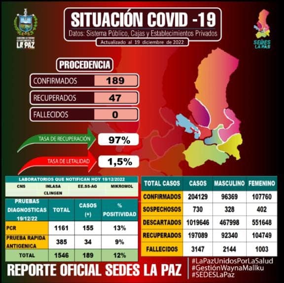 🔵 #ANF I El Sedes de #LaPaz reportó que esta jornada se registraron 189 casos de #COVID19 y 47 pacientes recuperados en el departamento. https://t.co/J9TAOoJhwZ