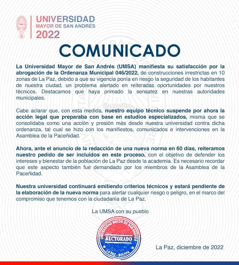 🔵 #ANF I La UMSA expresa su satisfacción por la abrogación de la Ordenanza Municipal 046 de construcciones irrestrictas en #LaPaz. Asimismo, anuncia que su equipo técnico suspendió «la acción legal con base en estudios especializados». https://t.co/ZBEmzWpUpR