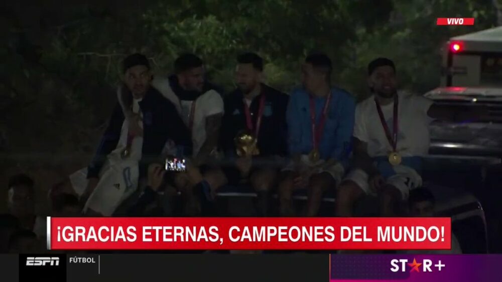 🔵 #ANF | #Argentina Tras su llegada al aeropuerto de Ezeiza, #LionelMessi, Ángel Di María, Leandro Paredes, Rodrigo de Paul y Nicolás Otamendi sufrieron un susto al casi chocar con un cable eléctrico mientras viajaban sobre el techo de un autobús. (📹VarskySports) pic.twitter.com/6rUHMROrza