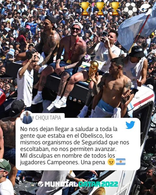 LES JODIERON LA CELEBRACIÓN A LOS CAMPEONES «No nos dejan llegar a saludar»: Chiqui Tapia culpó a los organismos de seguridad por no poder continuar rumbo al Obelisco. Y de ahí los hicieron sobrevolar 🚁 a la gente