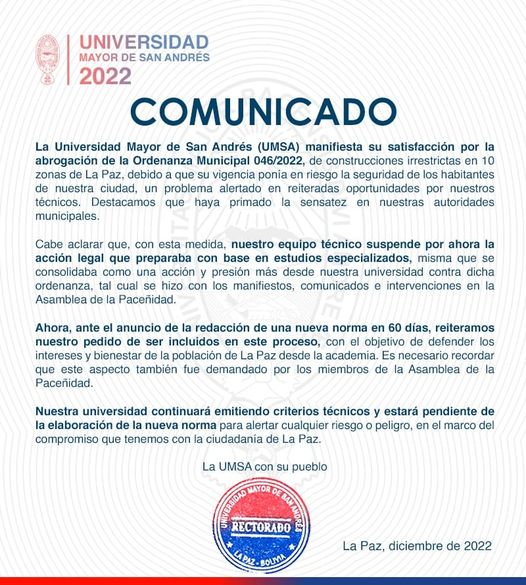 #LaPaz: UMSA expresa su satisfacción por abrogación de Ordenanza Municipal 046 de construc…