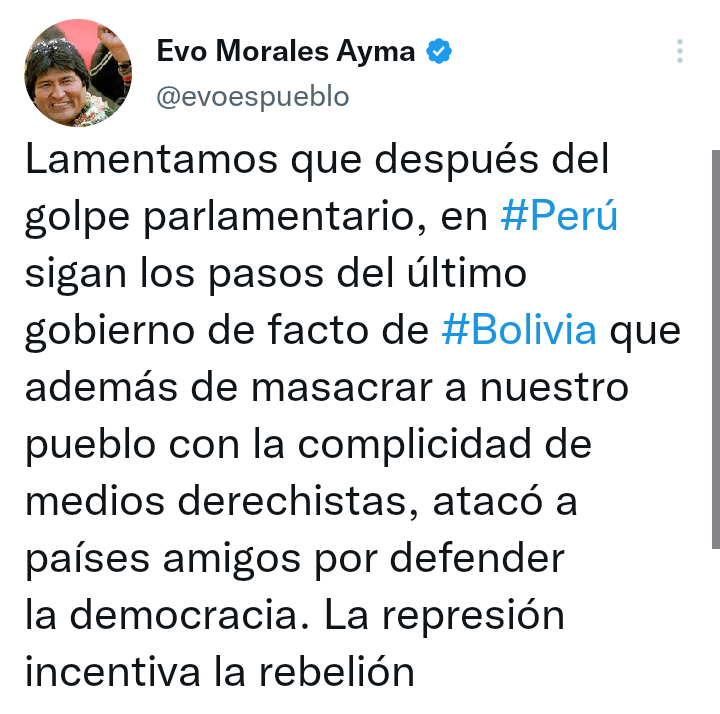 🔵 #ANF | «Lamentamos que después del golpe parlamentario, en Perú sigan los pasos del último gobierno de facto en #Bolivia», dijo Evo Morales tras que el congreso peruano determinara adelantar las elecciones para abril de 2024. «La represión incentiva la rebelión», tuiteó. https://t.co/Dr0Dw5odhi