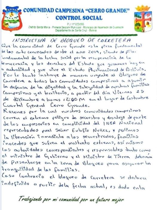 A raíz de la intervención que realizó la Policía, el INRA y el Ministerio Público, en los predios las tojas logrando aprehender a 12 personas implicadas en delitos de avasallamiento y daño al medio ambiente, lanzaron un comunicado de advertencia que de no ser liberados iniciaran un bloqueo de la carretera que une a Santa Cruz y el departamento del Beni.