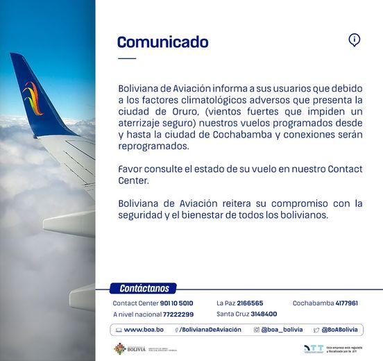 BoA emite comunicado donde indica que vuelos desde y hacia Cochabamba y conexiones fueron reprogramados