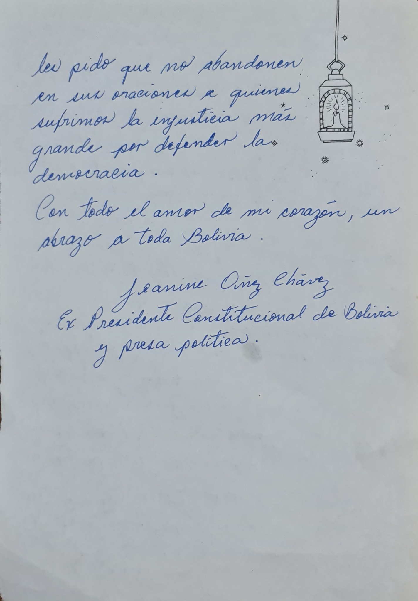 «Que la Gloria del Señor bendiga sus hogares y fortalezca sus espíritus ante la adversidad. Ningún bien es tan preciado como la vida, la salud y la libertad. Con todo el amor de mi corazón, un abrazo a toda Bolivia», expresó la expresidenta Jeanine Añez.