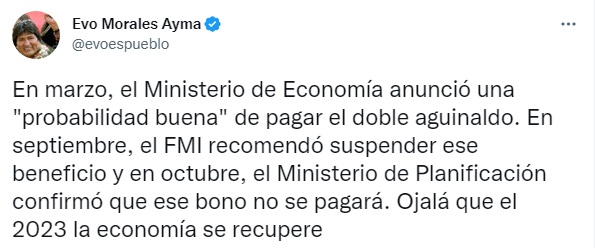 #ANF El expresidente Evo Morales cuestiona la situación económica del país. “Ojalá que el 2023 la economía se recupere”, agrega. 👇 https://t.co/Bf7Nd7HMMk