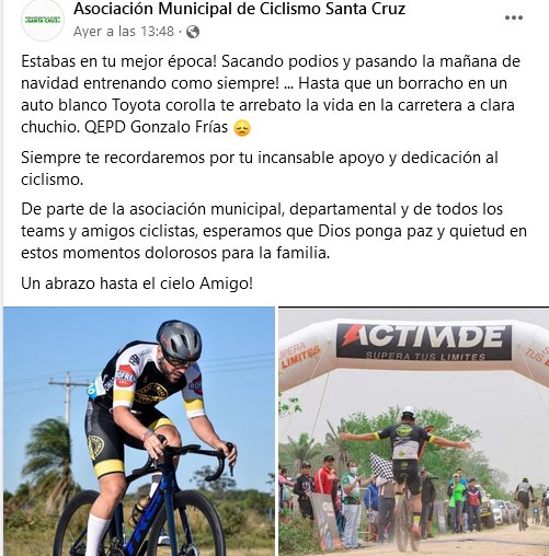 «Un abrazo hasta el cielo amigo» le dicen a ciclista español, Gonzalo Frías, desde la Asociación de Ciclismo de SCZ