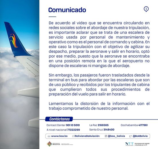 Boliviana de Aviación emitió un comunicado sobre el video viralizado en las últimas horas donde su tripulación abordaba el avión con una escalera de servicio. Aseguran, la información fue distorsionada.