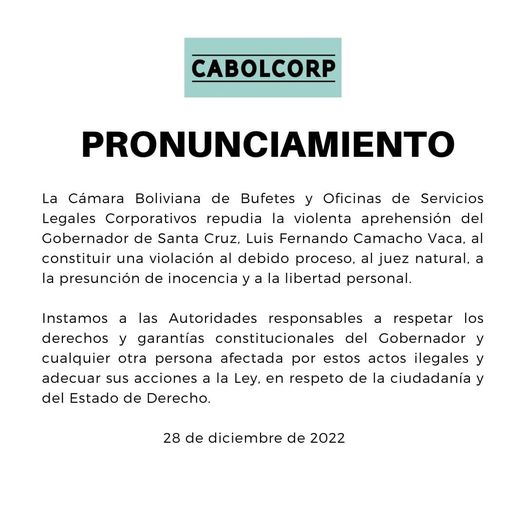 CABOLCORP expresa su rechazo a aprehension del Gobernador Luis Fernando Camacho