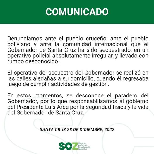Comunicado de la gobernación denuncia secuestro del gobernador Luis Fernando Camacho, se desconoce su paradero.