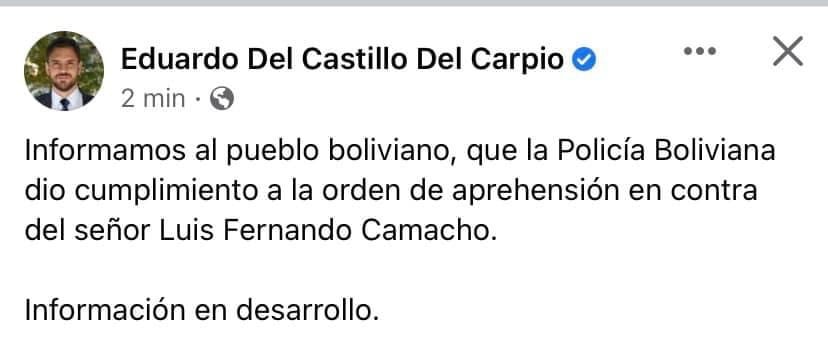 El Ministro Eduardo del Castillo confirma la aprehensión de Luis Fernando Camacho.
