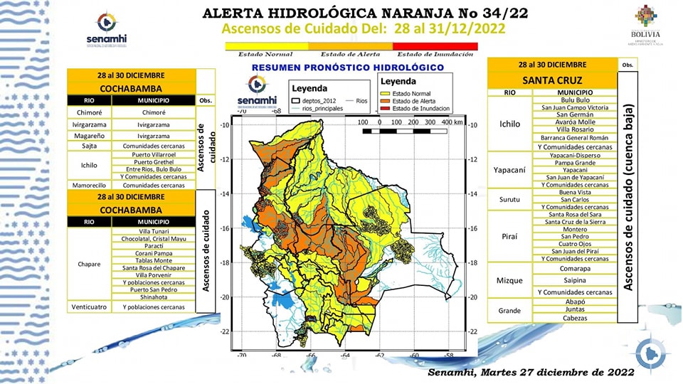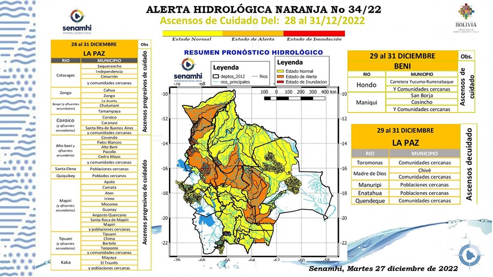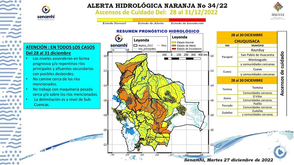 🔵 #ANF | El Senamhi emitió un aviso de alerta naranja por posibles desbordes de ríos en los departamentos de #Chuquisaca, #LaPaz, #SantaCruz, #Cochabamba y #Beni. pic.twitter.com/kv5ZdfiPSi