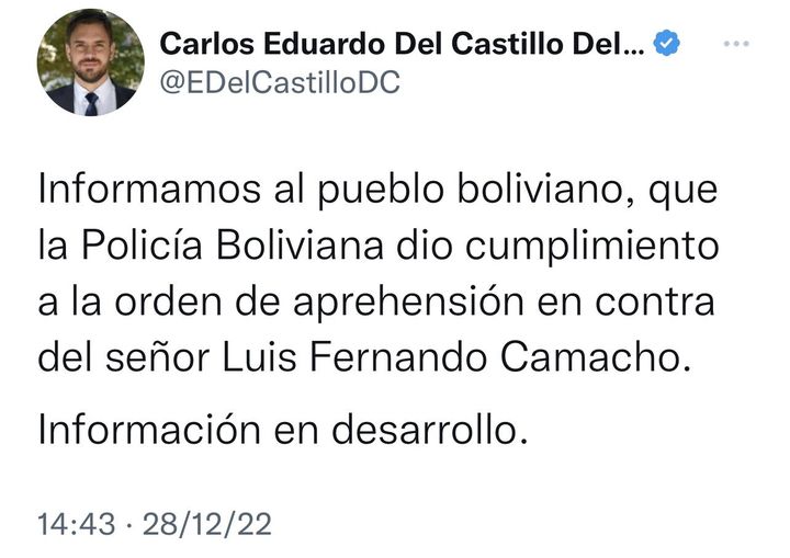 Ministro de Gobierno confirma secuestro de Luis Fernando Camacho, Gobernador de Santa Cruz