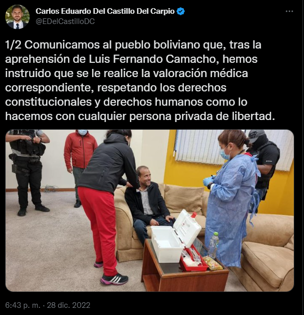 🔵 #Ultimo I Ministro de Gobierno publica una fotografía de Luis Fernando Camacho y asegura que la autoridad fue sometida a una valoración médica «respetando los derechos constitucionales y derechos humanos como lo hacemos con cualquier persona privada de libertad». https://t.co/eQsx18XexN