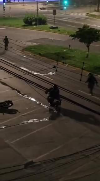 Efectivos policiales destruyen una motocicleta estacionada, en medio de los enfrentamientos que se suscitan en #SantaCruz.