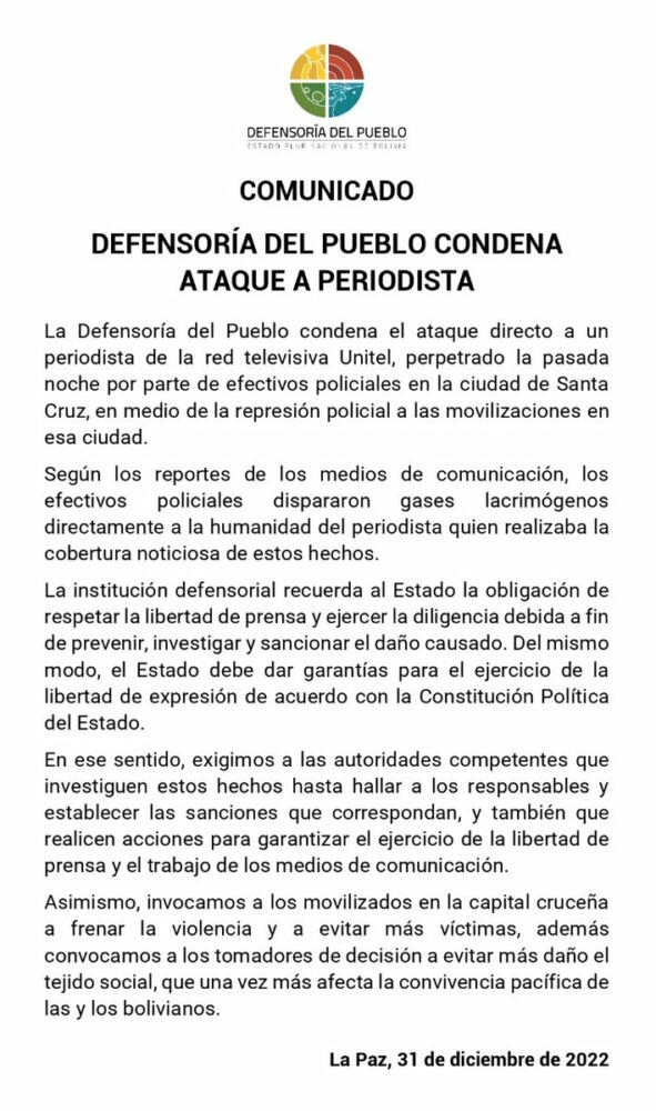 | #Sociedad La @DPBoliviaOf condena la agresión a periodistas por parte de …