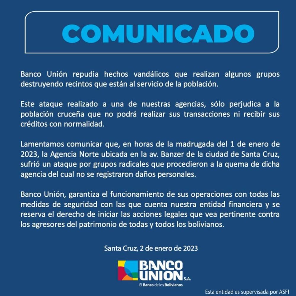 🔵#ANF | #Seguridad El Banco Unión cuestionó la quema y destrozos a la Agencia Norte en la ciudad de #SantaCruz, en medio del conflicto desatado por la detención del gobernador Luis Fernando Camacho. https://t.co/6eOXynHN74