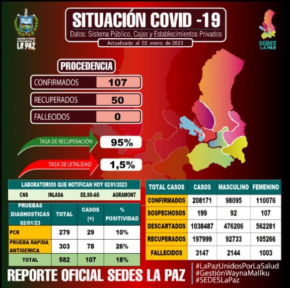 đ”#ANF | #Sociedad El Servicio Departamental de Salud de La Paz reportĂł esta jornada 107 contagios nuevos de #COVID19, ningĂșn fallecido y 50 personas vencieron a la enfermedad. https://t.co/S7ZQxZRtaJ
