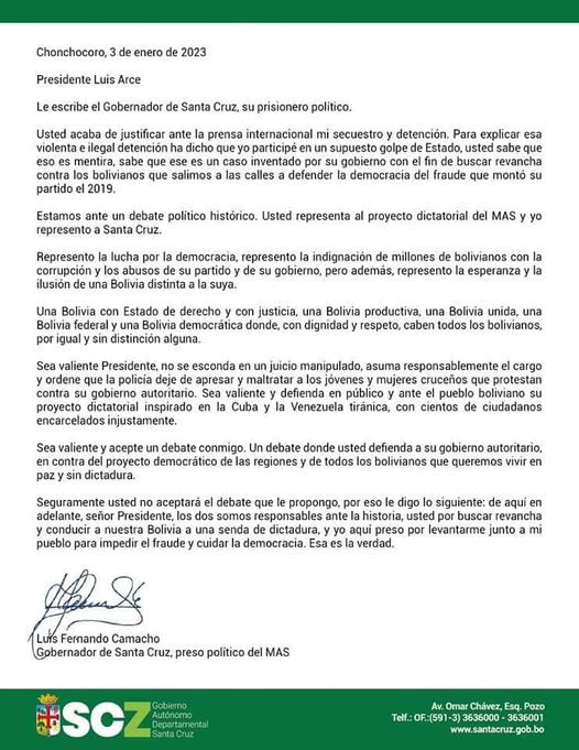 Usted acaba de justificar ante la prensa internacional mi secuestro y detención. Para explicar esa violenta e ilegal detención ha dicho que yo participé en un supuesto golpe de Estado, usted sabe que eso es mentira, sabe que ese es un caso inventado por su gobierno con el fin de buscar revancha contra los bolivianos que salimos a las calles a defender la democracia del fraude que montó su partido el 2019.