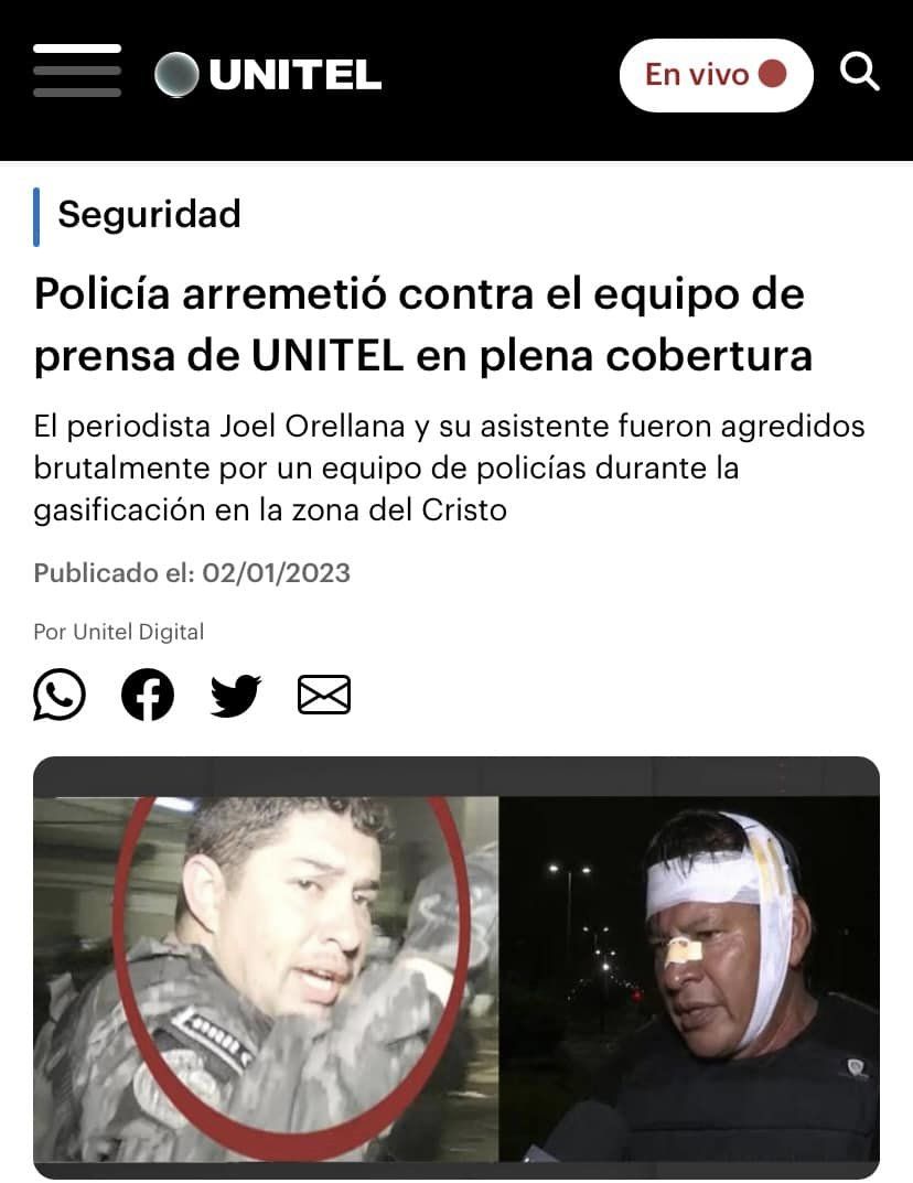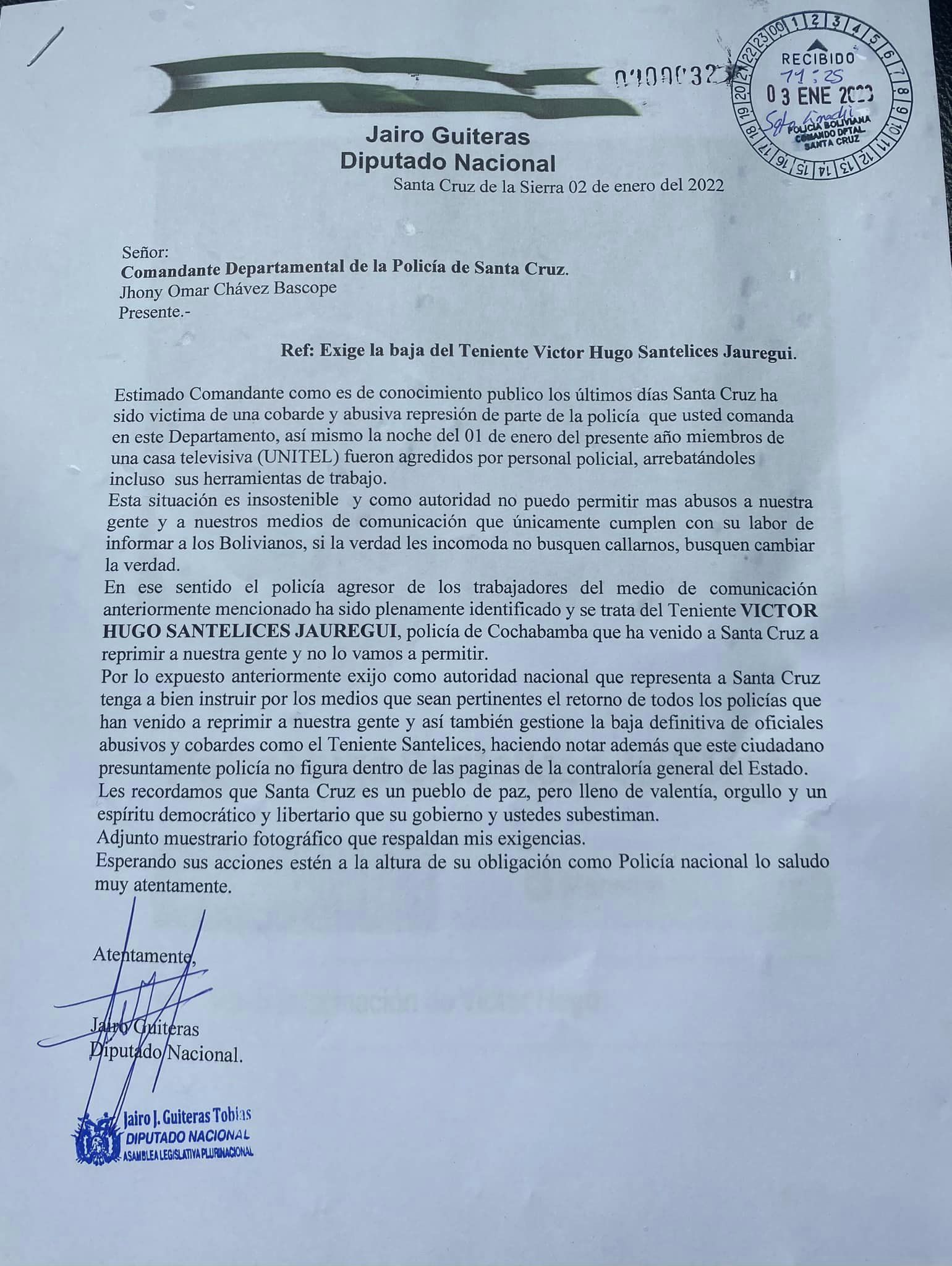 «Estoy saliendo del Comando Departamental de la Policía. Vine solo no en bollo como andan ellos. He dejado mi carta denunciando al Teniente Víctor Hugo Santelices Jáuregui Policía de Cochabamba encargado de reprimir a la prensa y a la gente en Santa Cruz», señaló el Diputado de Comunidad Ciudadana, Jairo Guiteras.